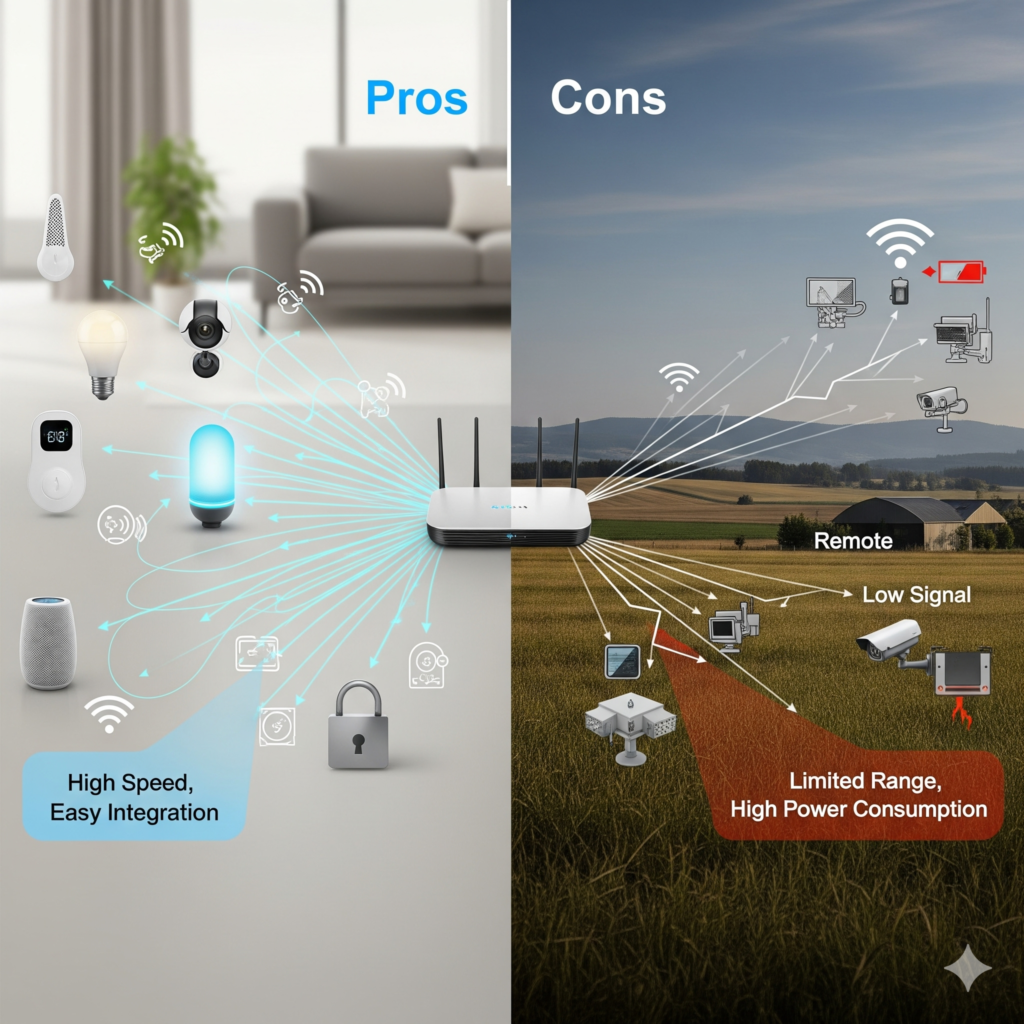 | Best Use Cases | Smart homes, offices, video-based IoT | Smart cities, agriculture, logistics |
