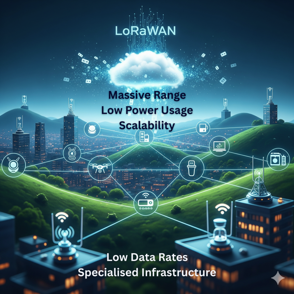 LoRaWAN is ideal for smart cities, agriculture, supply chain monitoring, and industrial IoT deployments where long range and low power are more important than speed.
